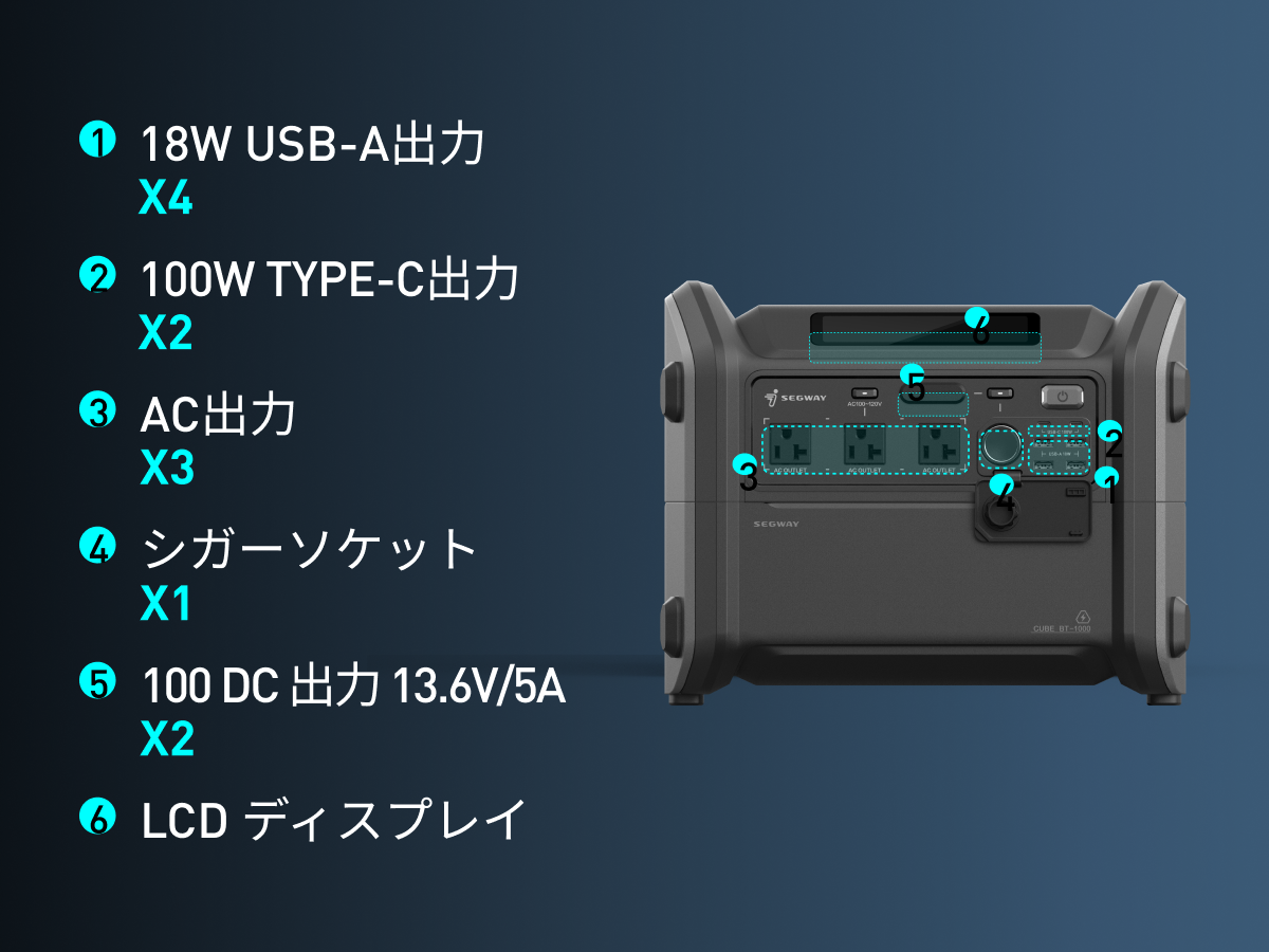 Segwayには、テレビや冷蔵庫などへ給電するためのACポートのほか、スマートフォンやパソコンを充電できるUSBポート、さらには便利なシガーソケットポートなど、合計12個の出力ポートが装備されており、最大12台のデバイスを同時に充電できます。
